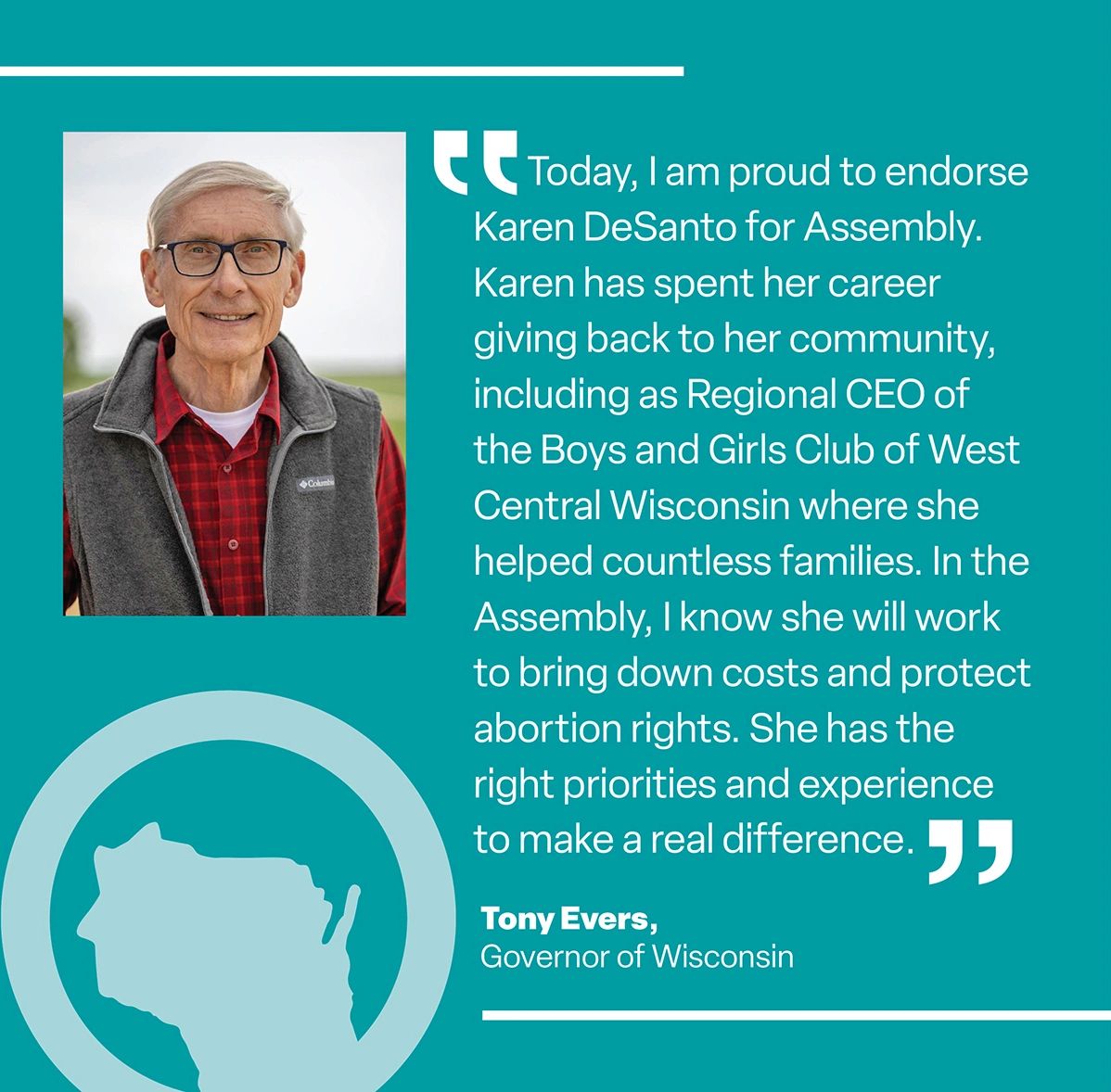 "Karen DeSanto’s dedication, tireless effort, and innovation with the Boys and Girls Club of Wisconsin in Sauk and Columbia counties have profoundly impacted countless young lives. Her unwavering commitment to youth development is a testament to her leadership. I wholeheartedly endorse Karen for Assembly District 40 and am confident that her vision and drive will continue to create a brighter future for the many generations to come."